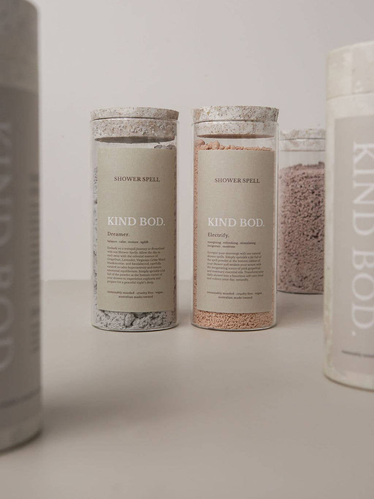 Energise your mornings with Kind Bods natural shower spells. Simply sprinkle the powder at the bottom corner of your shower and awaken your senses with the invigorating scents of pink grapefruit and rosemary essential oils. Transform your daily shower into a luxurious self-care ritual and enliven your day, naturally.